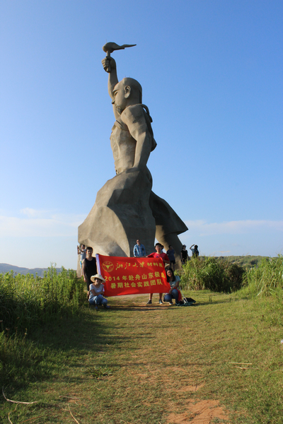 当再次回到庙子湖岛后,我们去参观了财伯公雕像和东极革命烈士纪念碑。据财伯公雕像处的碑文记载,此雕像建于2003年10月,高20米。雕像原型财伯公,原名陈财福,福建人,是第一个登上庙子湖岛的人,那时的福建渔民身上穿的是背心和笼裤,就是财伯公雕像上的装束。陈财福在经历海难到达庙子湖岛后发现这个港湾可以避风挡浪,为了不使其他渔民重蹈覆辙,于是留在岛上,每逢雾天,他就上山点柴火为过往船只导航,指引他们到庙子湖港湾避风。后来陈财福力竭身亡,被之后的渔民发现了真相后,把陈财福视为心中的活菩萨,并为他见庙塑泥像进行供奉,并将他点火导航的这座山取名为“放火山”,从此“青浜庙子湖,菩萨穿笼裤”的传说就这样流传开来了。在得知财伯公的故事之后,我们心中充满了敬佩之感。作为一名中共党员,我们更应该继承这种高尚的精神,不畏艰辛,全心全意地为人民服务。